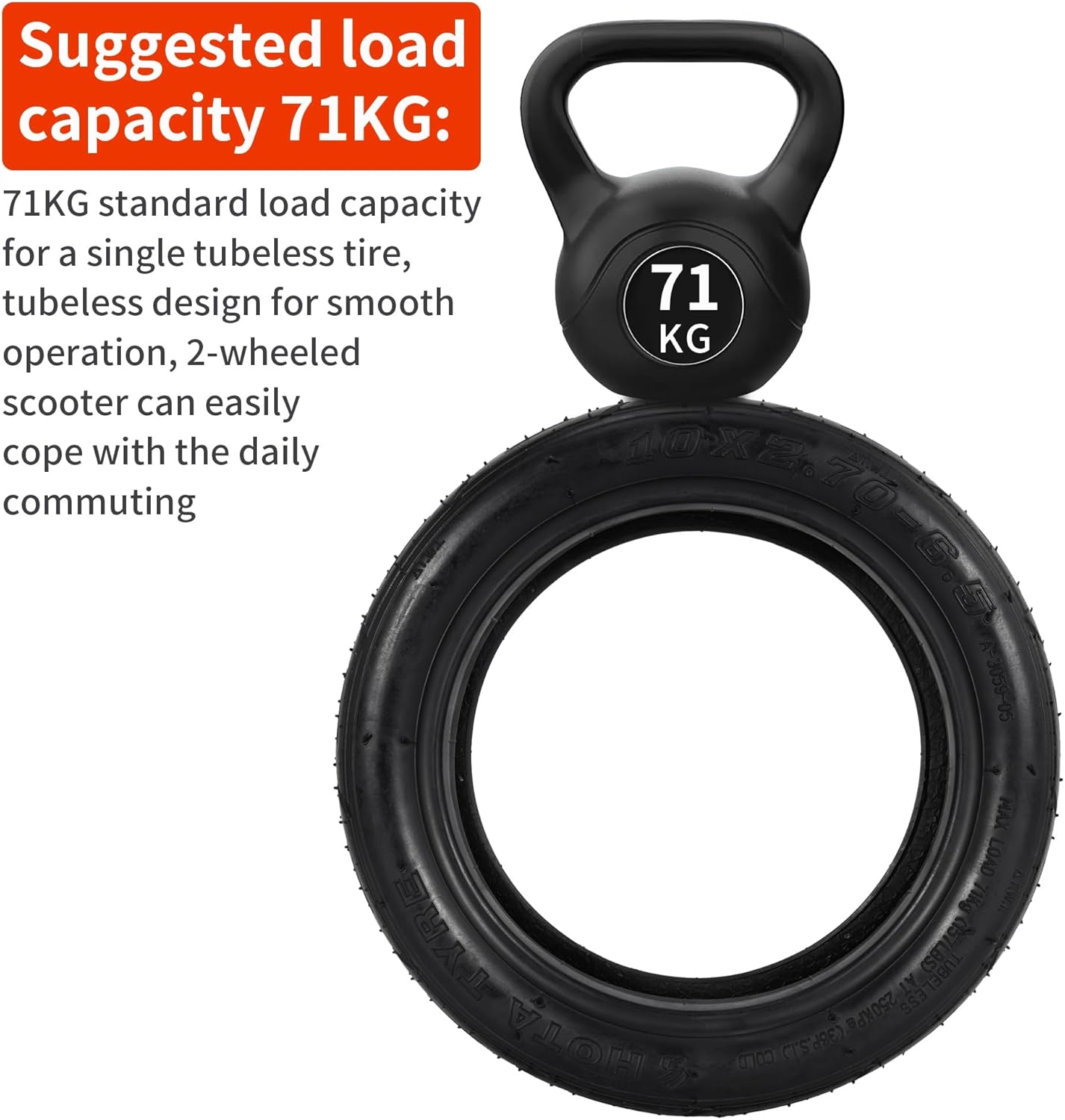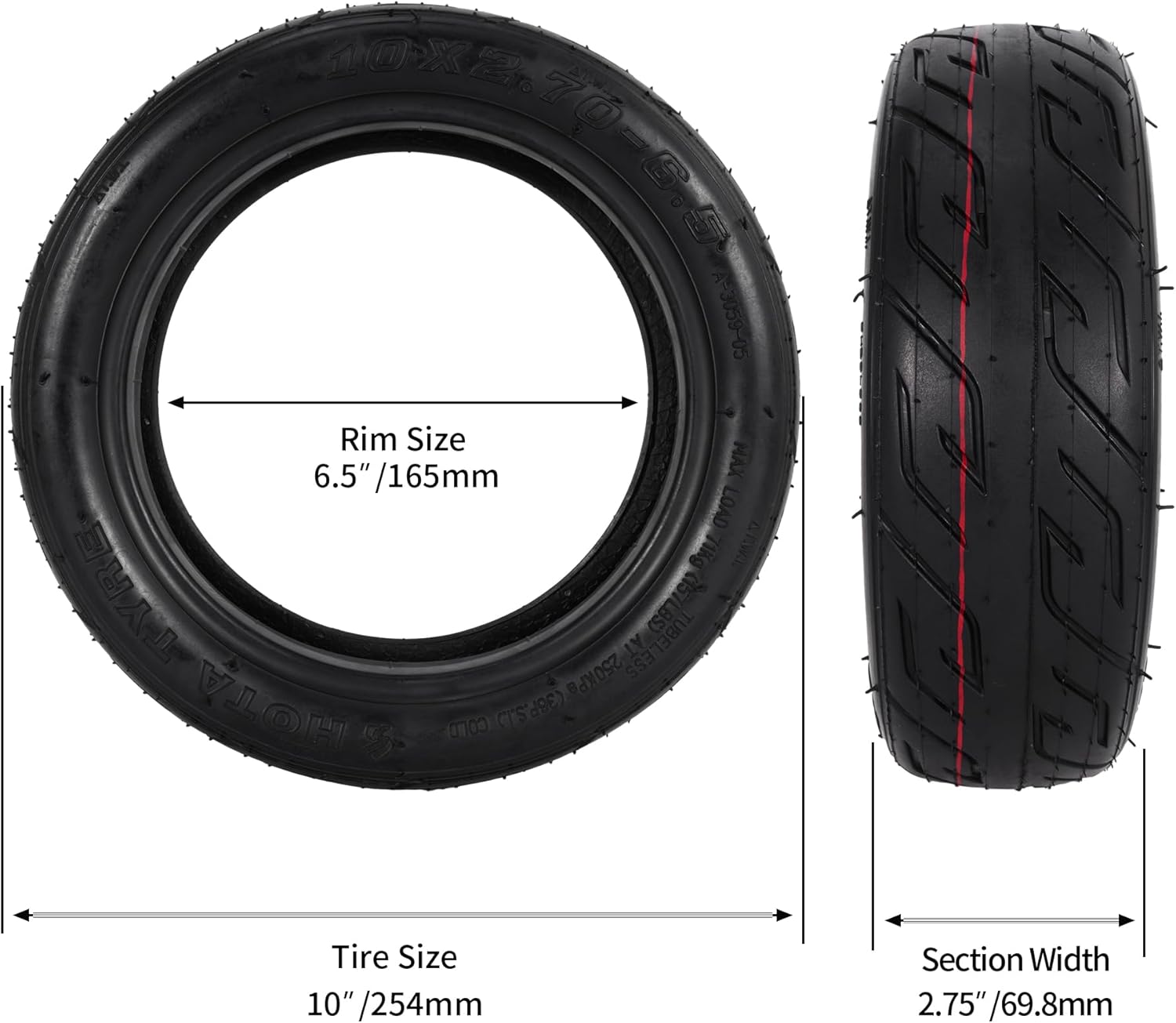 - Parameters: This 10×2.70-6.5 tire has a width of 2.70 inches and a height of 10 inches, suitable for mounting on 6.5-inch rims. The maximum load of a single electric scooter tire is 71kg, if you need a higher load capacity, you can also install the corresponding size inner tube together.