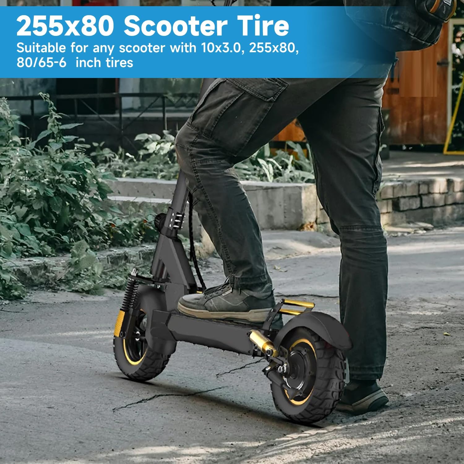- Features: 255×80 scooter tires are made of thick, flexible rubber material and are not prone to cracking and punctures, which ensures a reliable ride on a variety of terrains. 10×3 electric scooter features a deep tread pattern designed for superior traction, reducing slippage on wet or uneven surfaces, providing stability and control