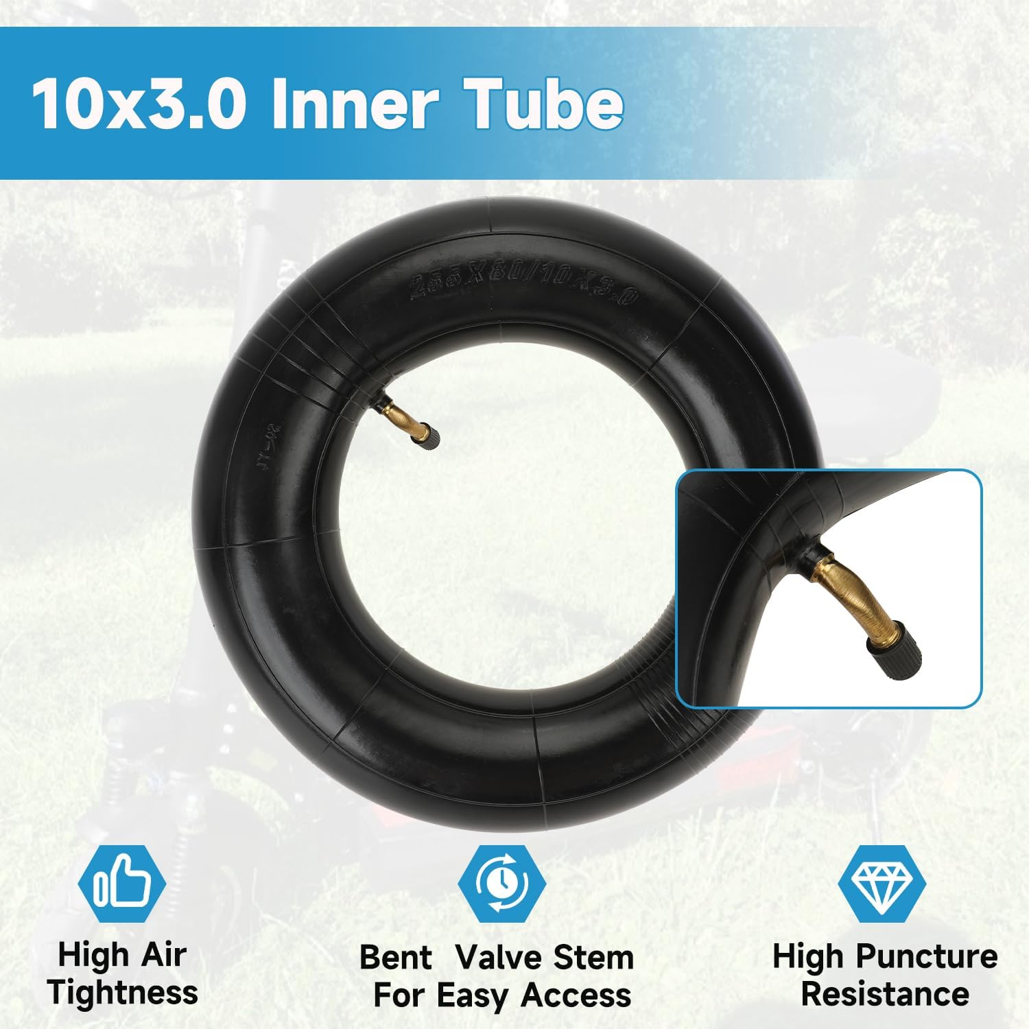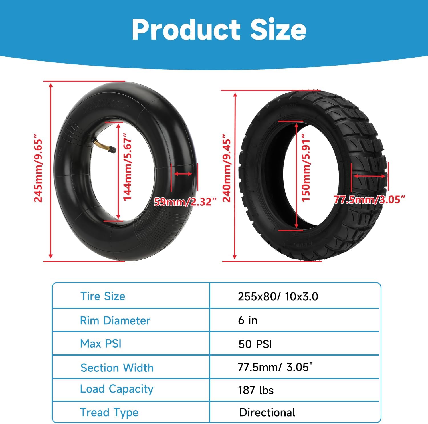 - Package Includes: 1 x 255×80 Scooter Tire, 1 x 10×3.0 Inner Tube, 6 x Self-Adhesive Round Patches, 1 x Metal Cleaning Rasp, 1 x Valve Core Wrench, 2 x Brass Valve Stem Cores, 2 x Red Stem Valve Caps, 2 x Black Stem Valve Caps