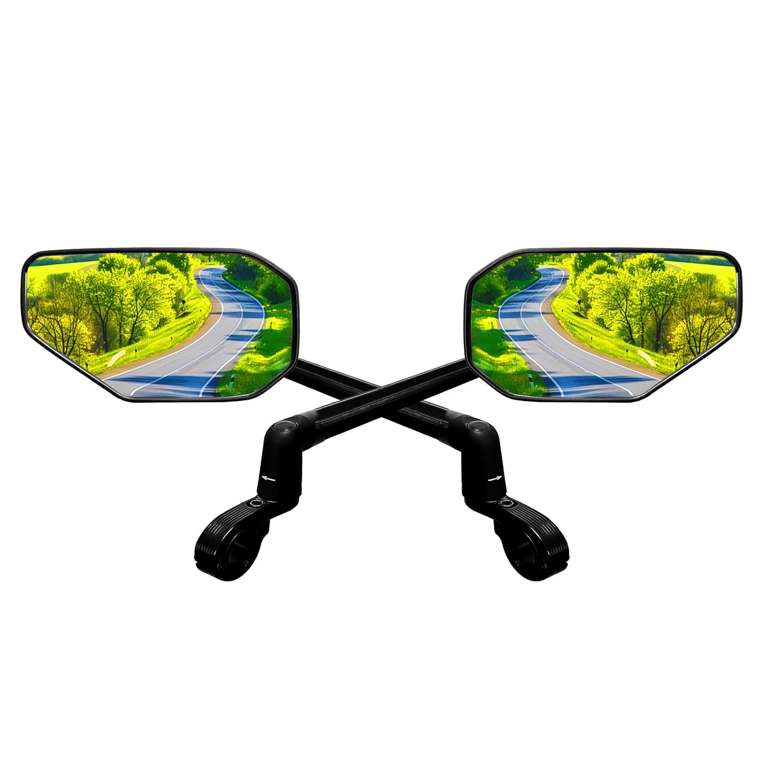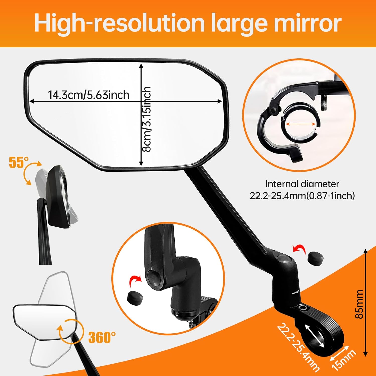 - Multi-adjustment system: The bicycle mirror can be swiveled 360° in three positions: The mirror bar can be swiveled 360° in any direction, the base can be swiveled 360° in one direction, and the mirror can be swiveled 360° and adjusted 55° up or down. This allows you to adjust the viewing angle in all directions without restricting your view.