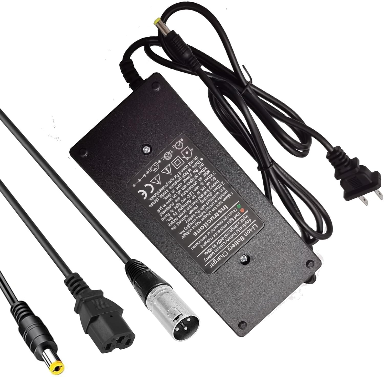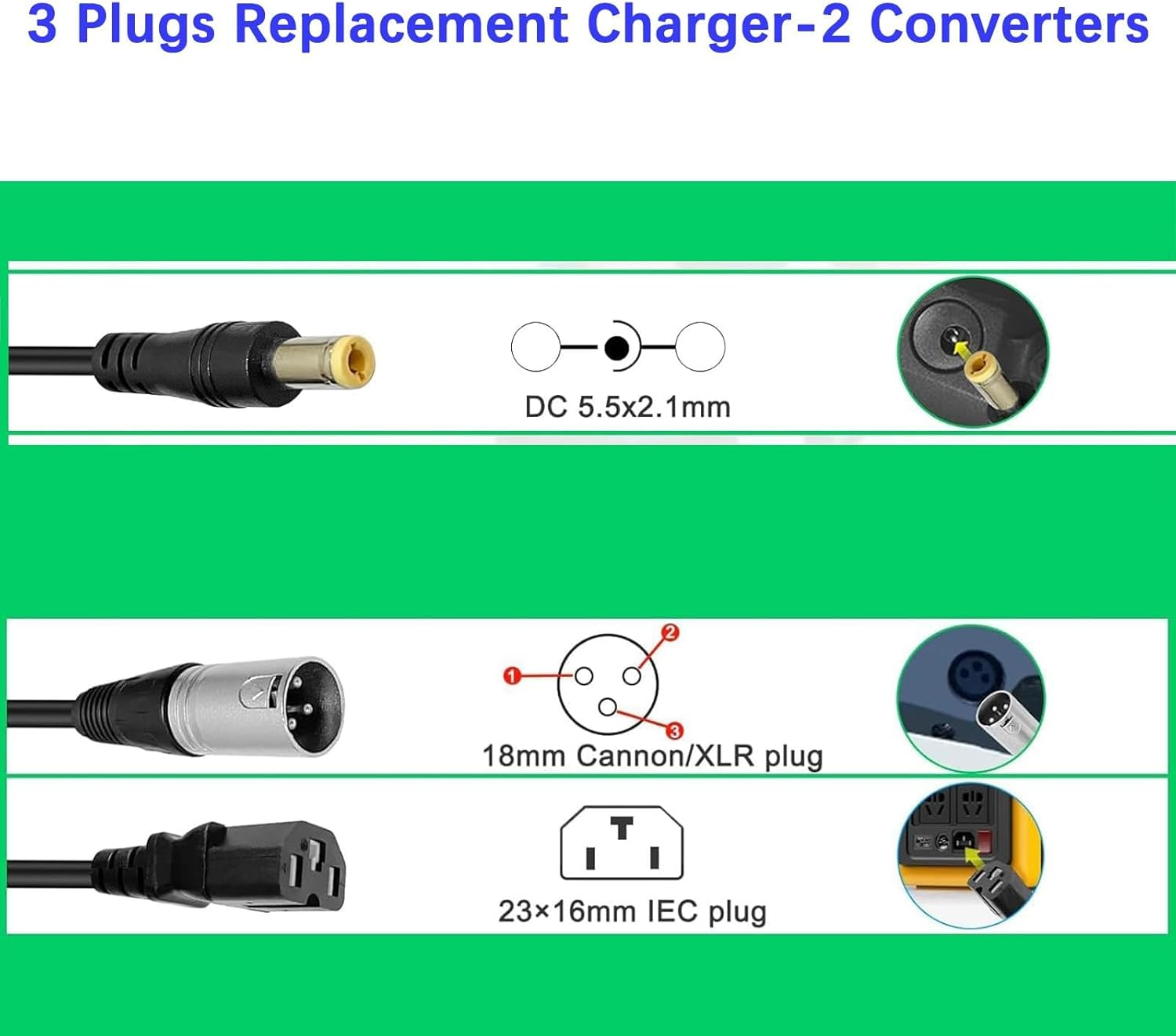 - Suitable for 72V Lithium Scooters Using for 3 Adapter: 5.5×2.1mm 1 prong DC plug(integrated with charger) / XLR or Cannon /IEC plug