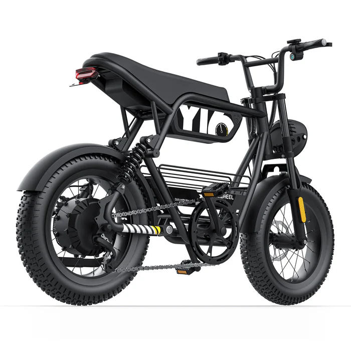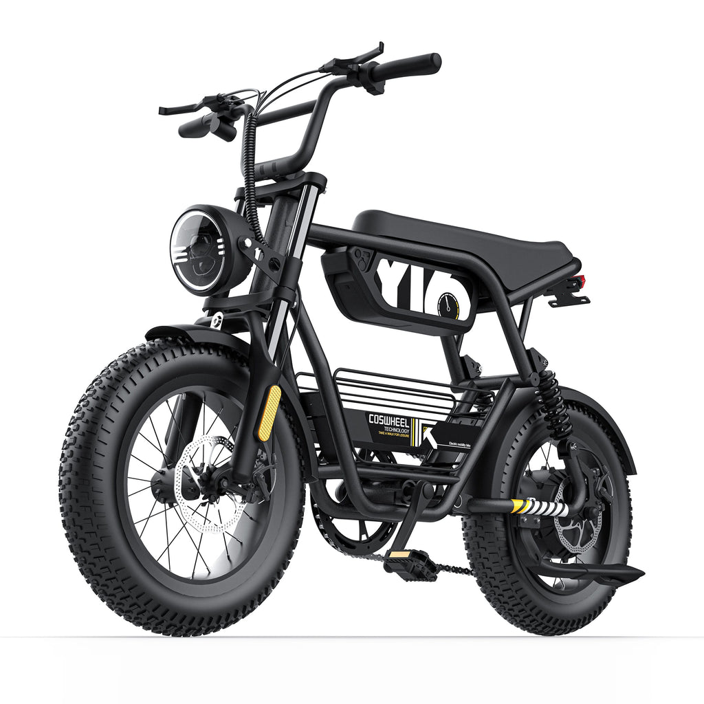 The Y16 electric bike is a new product of COSWHEEL in 2014, equipped with a peak 1000W (rated 750W) motor, 15AH lithium battery, 52 miles (84km) of range, and a maximum speed of 28mph (45km/h). The Y16 rear suspension is equipped with dual suspension spring shock absorbers and retro angel headlights, making your ride safer.