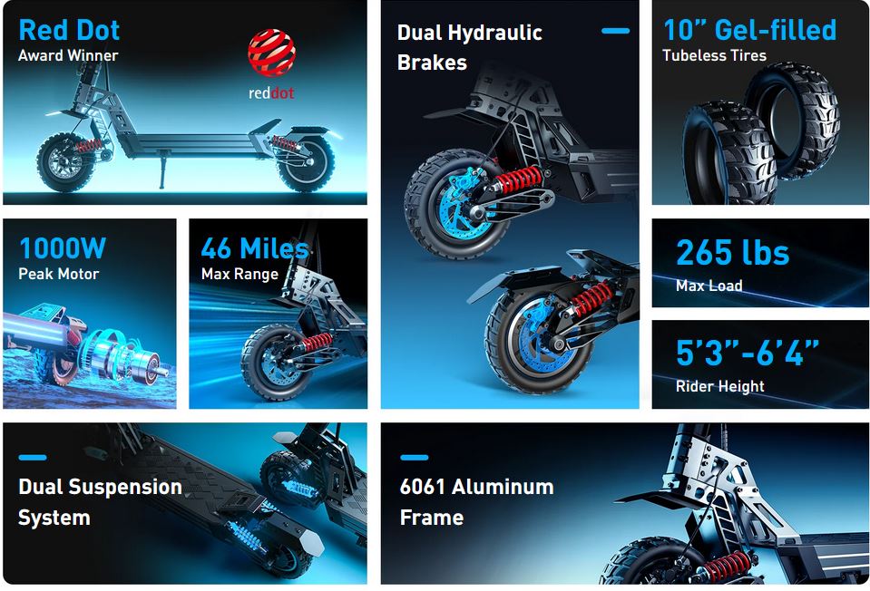 The dual suspension system and 10-inch gel-filled tubeless tires absorb shocks and offer superior stability, delivering a smooth and comfortable ride on all terrains, whether rough or smooth.