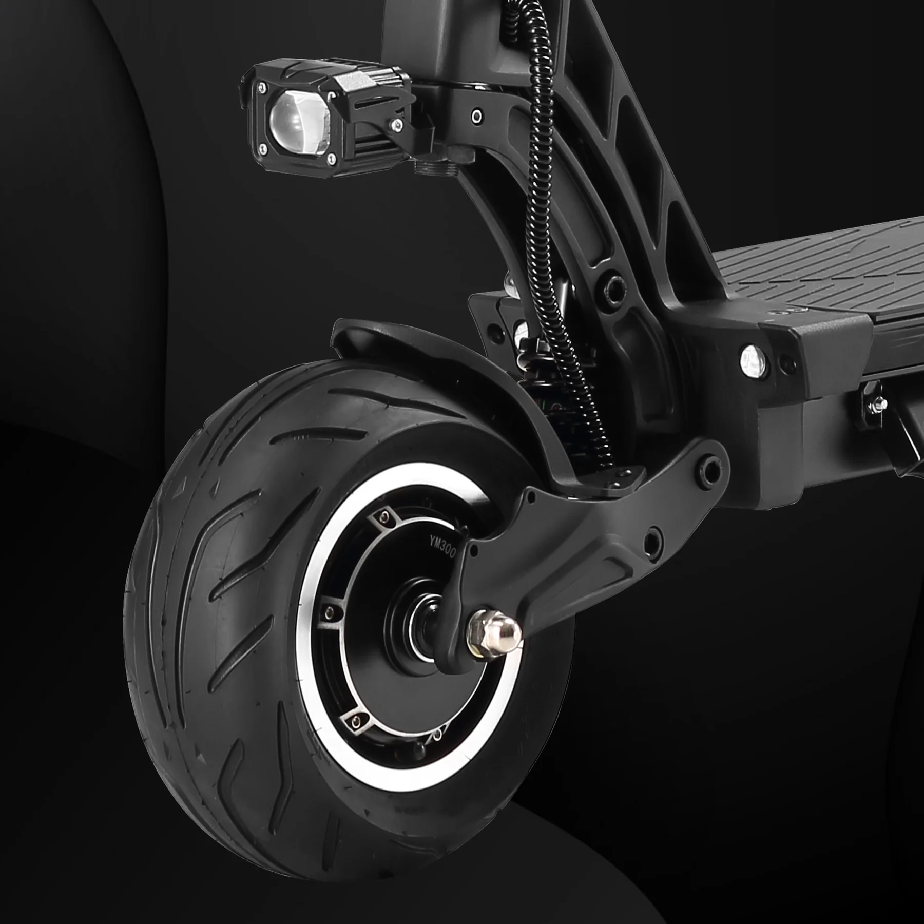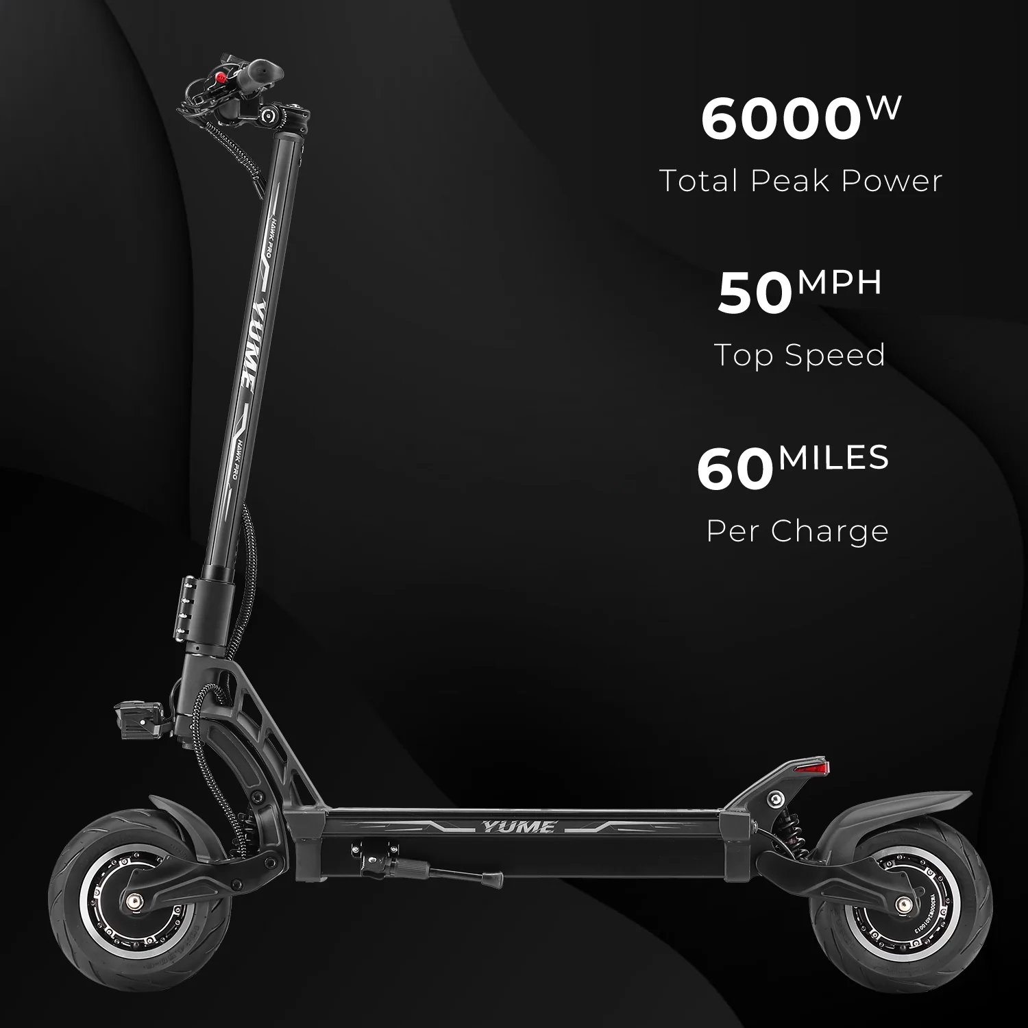 For those who demand more power and speed, YUME is pleased to introduce the incredible Hawk Pro. This pro version of the YUME Hawk comes with a new wider and longer deck and features two powerful 3000W motors. This comes paired with two new custom designed compact sine wave controllers (Super 6 mosfet) and is powered by either a 60V 30Ah or a 60V 27Ah battery. The 10″ tubeless street fat tires on the Hawk Pro are also wider (4.5″wide) giving enhanced grip to match the increased performance.